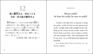 本書は、谷口清超先生が監修されてきた日めくりカレンダー『ひかりの言葉』の日英対訳版です。これまでに第1集(2005年刊)、第2集(2006年刊)、第3集(2007年刊)と3冊刊行され、不透明な時代を生きる人々に光をもたらすメッセージ集として好評をいただいております。