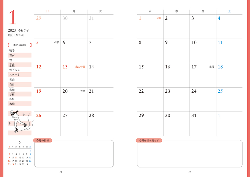 2つ目は、各月のカレンダーページに「季語の紹介」をしていること。季節感を表現する季語を使って俳句を詠んだり、手紙を書く際の時候の挨拶で使ったりすることができます。