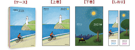 2025年版の表紙イラストは、神奈川県在住のイラストレーター・秋葉あきこさんが描いたもので、上巻表紙には、女性が海沿いの道を自転車で走る様子が、下巻表紙には満月の夜に公園のベンチでひと休みする様子がそれぞれ描かれています。