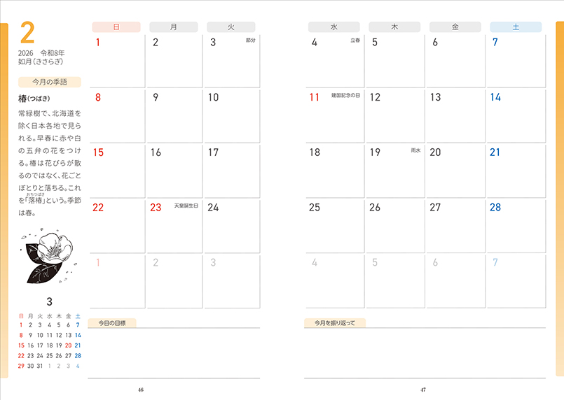 1つ目は、各月のカレンダーページに「季語の紹介」をしていることです。季節感を表現する季語を使って俳句を詠んだり、手紙を書く際の時候の挨拶で使ったりすることができます。